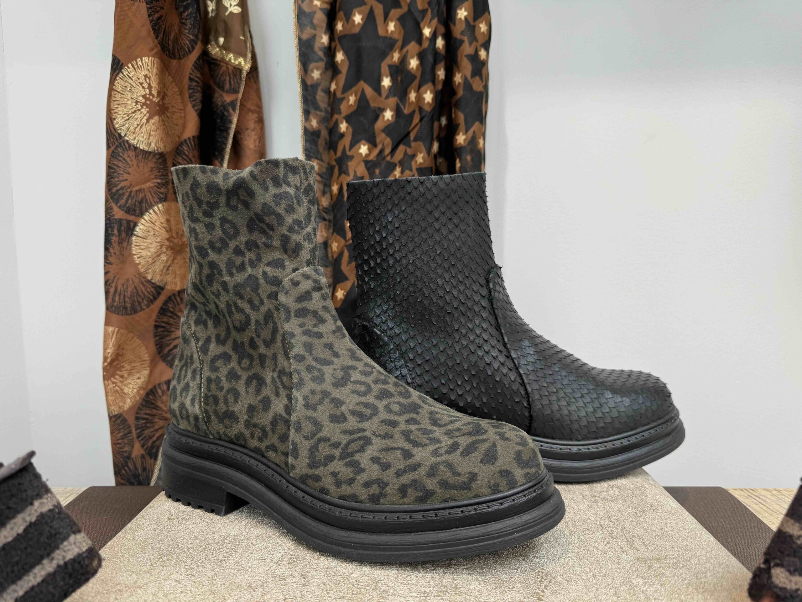 Boots ALIWELL montante à zip, cuir noir python ou nubuck léopard