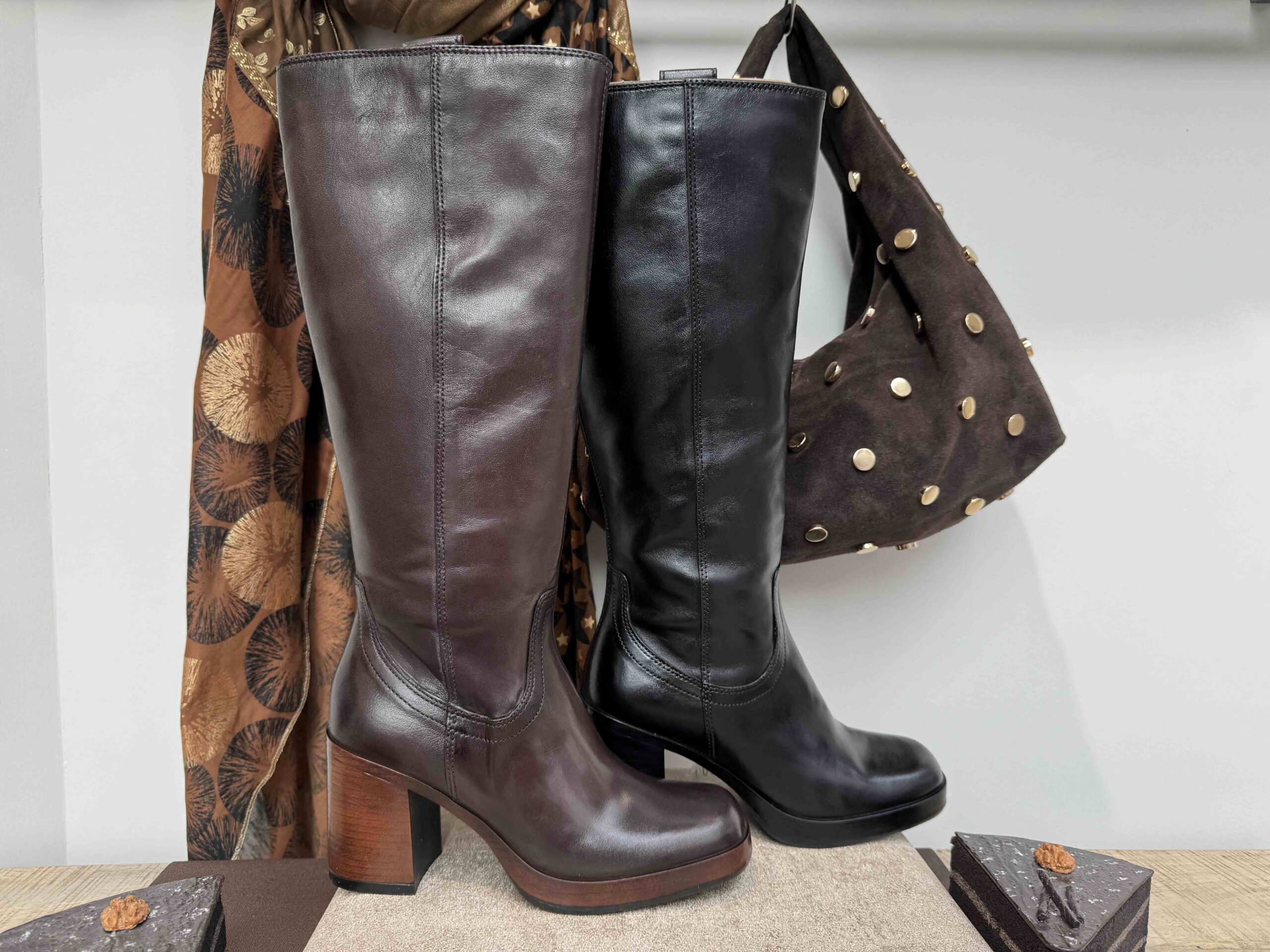 Botte MJUS à talon, bout carré, en cuir noir ou chocolat