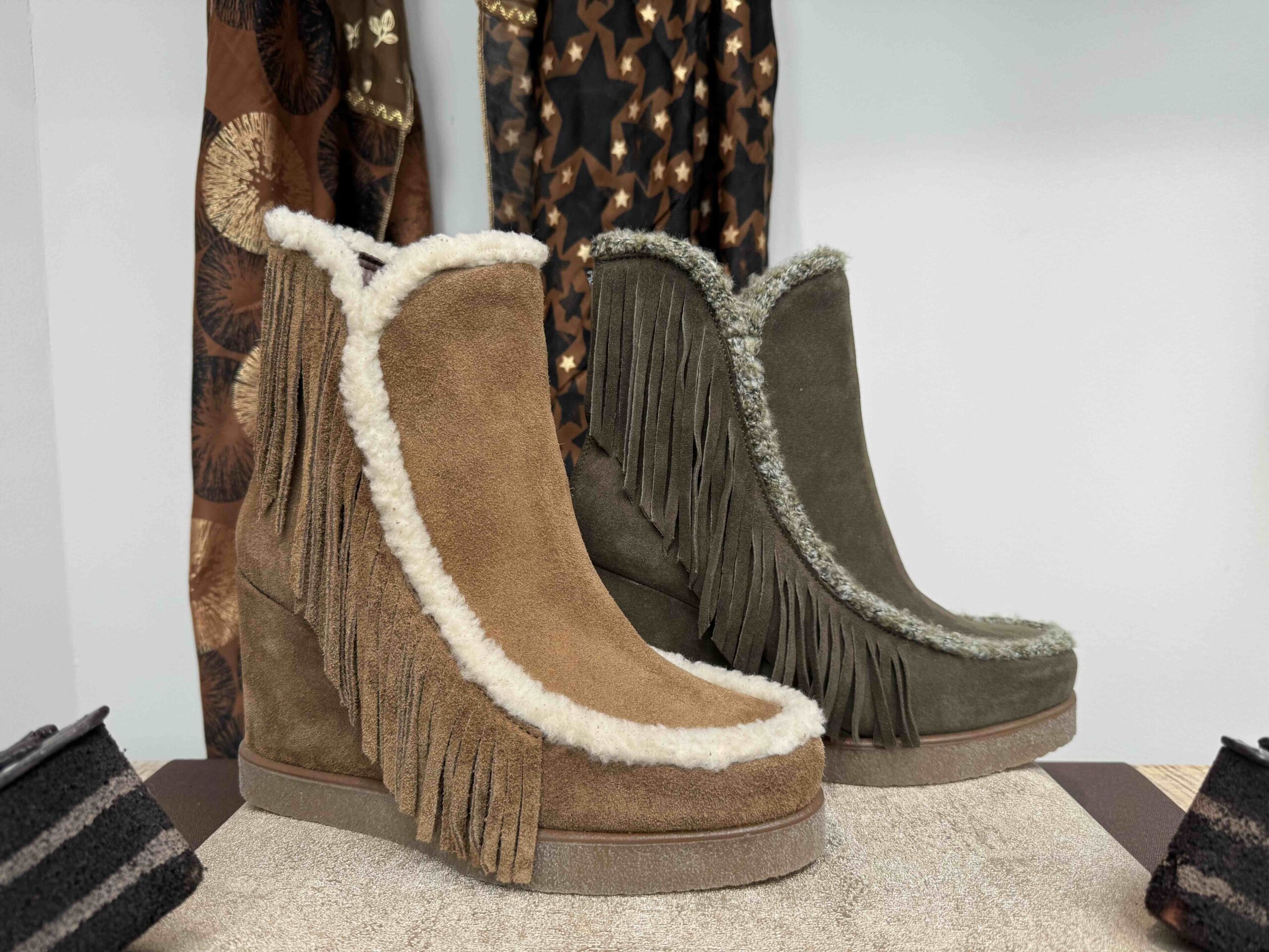/ Bottine MIMKA compensée à frange, en nubuck camel ou kaki
