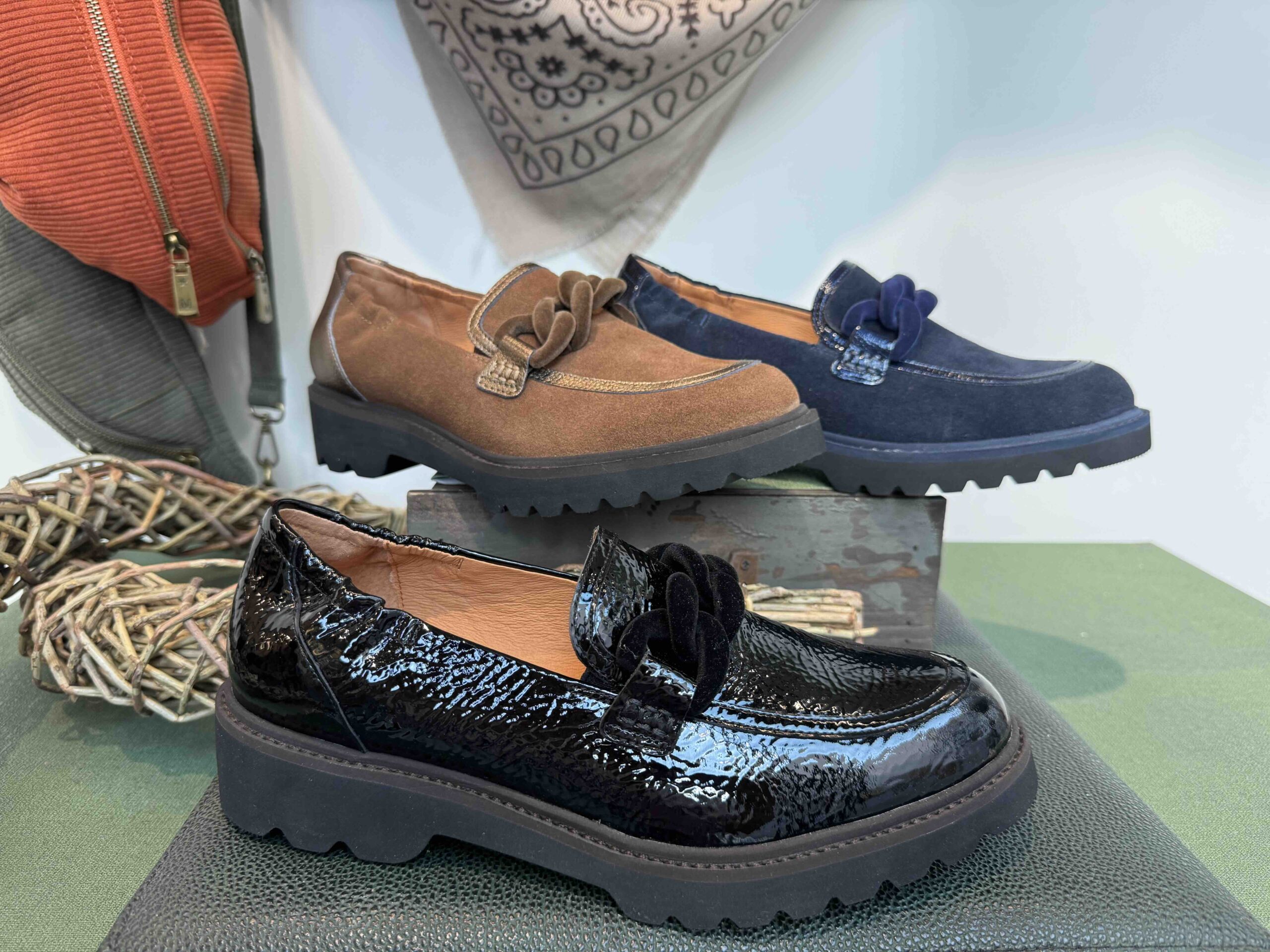 / Mocassin FUGITIVE avec boucle en nubuck bleu, chocolat ou noir vernis