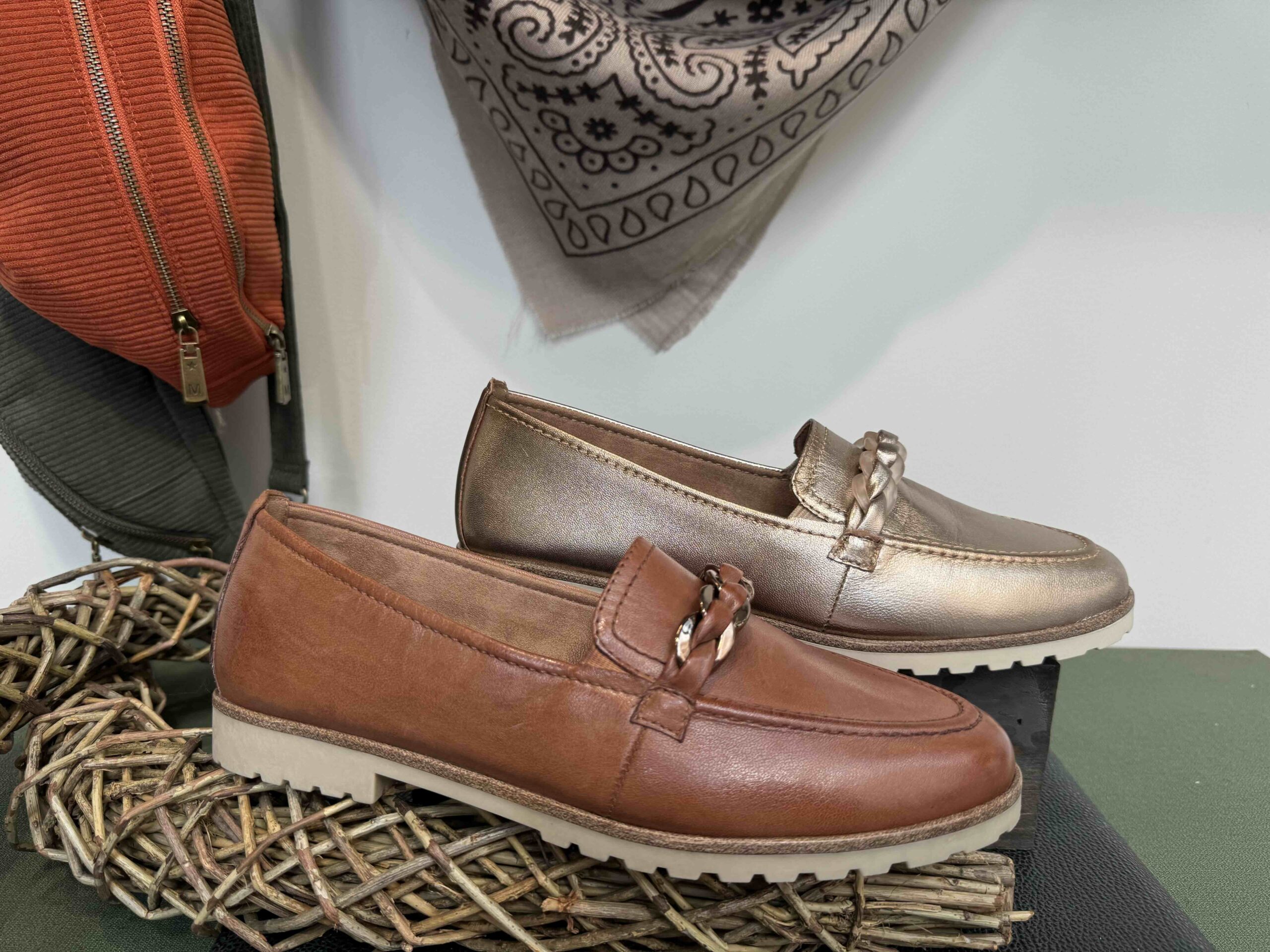 Mocassin TAMARIS cuir doré et camel + bijoux